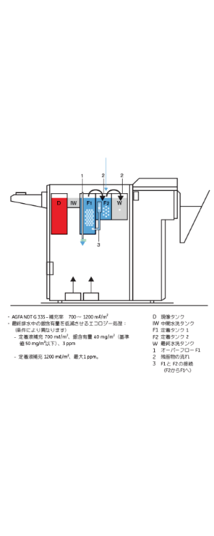 現像処理排水中の銀含有量を劇的に減少させる秘密は、定着を2槽にした“カスケード2段階定着システム”にあり、最終排水中の銀含有量はわずか約40mg/㎡です。今後ヨーロッパ規格で50mg/㎡以下と規定されることが考えられますが、NDT S ecoは十分にその基準を満たします。